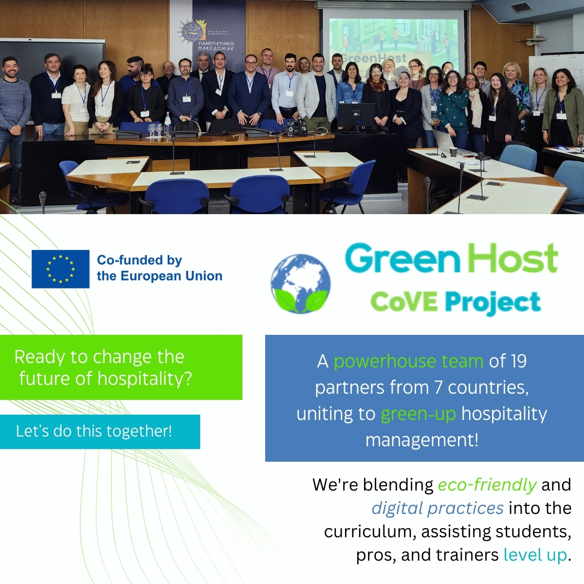 O projeto GreenHost é financiado pelo programa Europeu Erasmus+ CoVe e reúne 19 parceiros, de 7 países — Bulgária, Espanha, Eslovénia, Chipre, Grécia, Itália e Portugal. Este projeto, onde a excelência profissional, política e empresarial se une pelas competências de gestão hoteleira adaptadas a métodos de gestão da pegada ambiental, foca-se em duas questões-chave para o setor da hotelaria e do turismo: a escassez de pessoal qualificado e a necessidade de se tornar ecológico e sustentável.